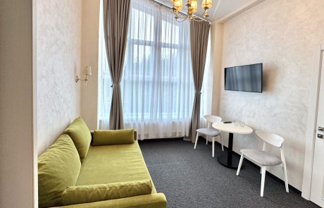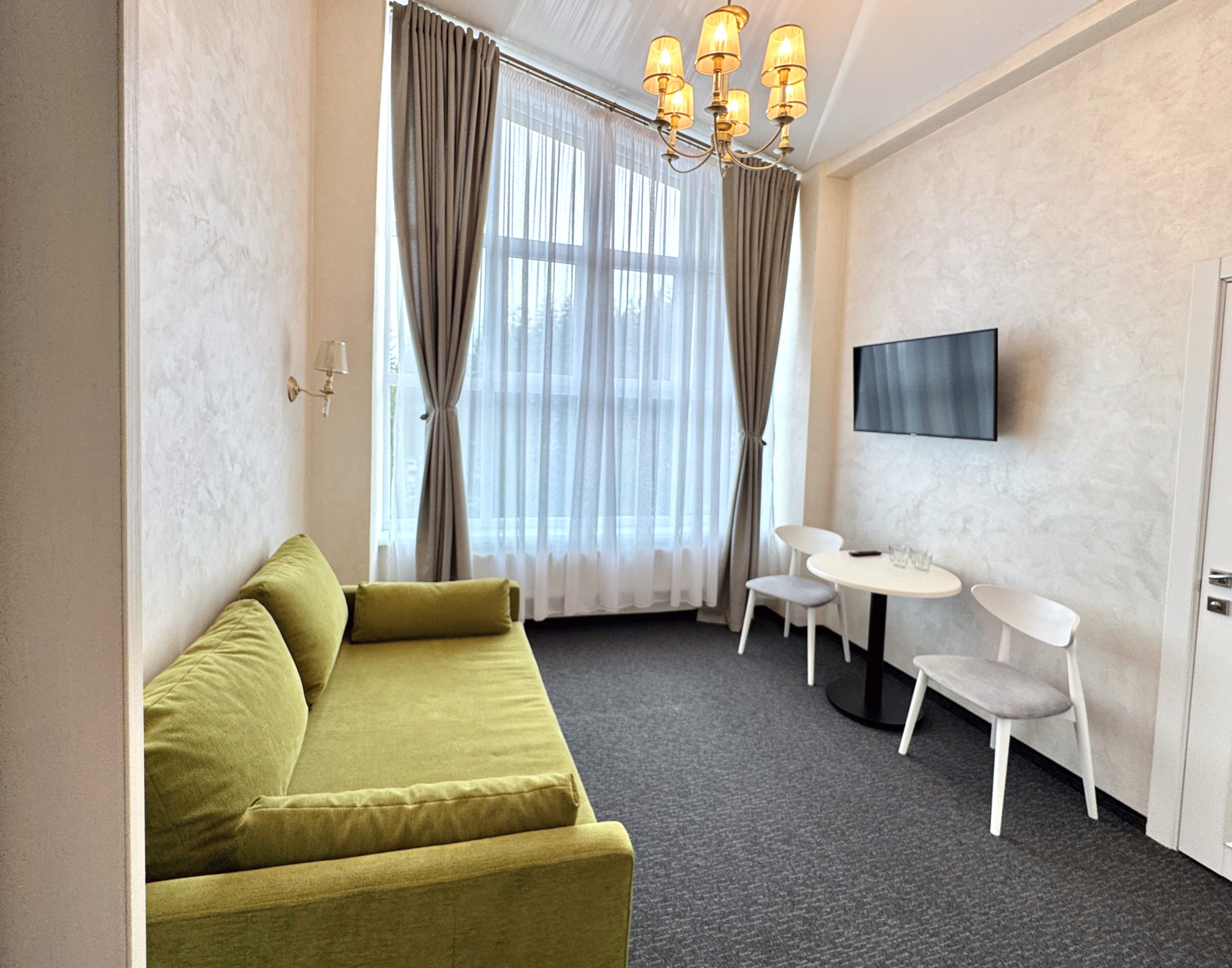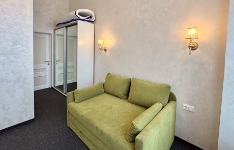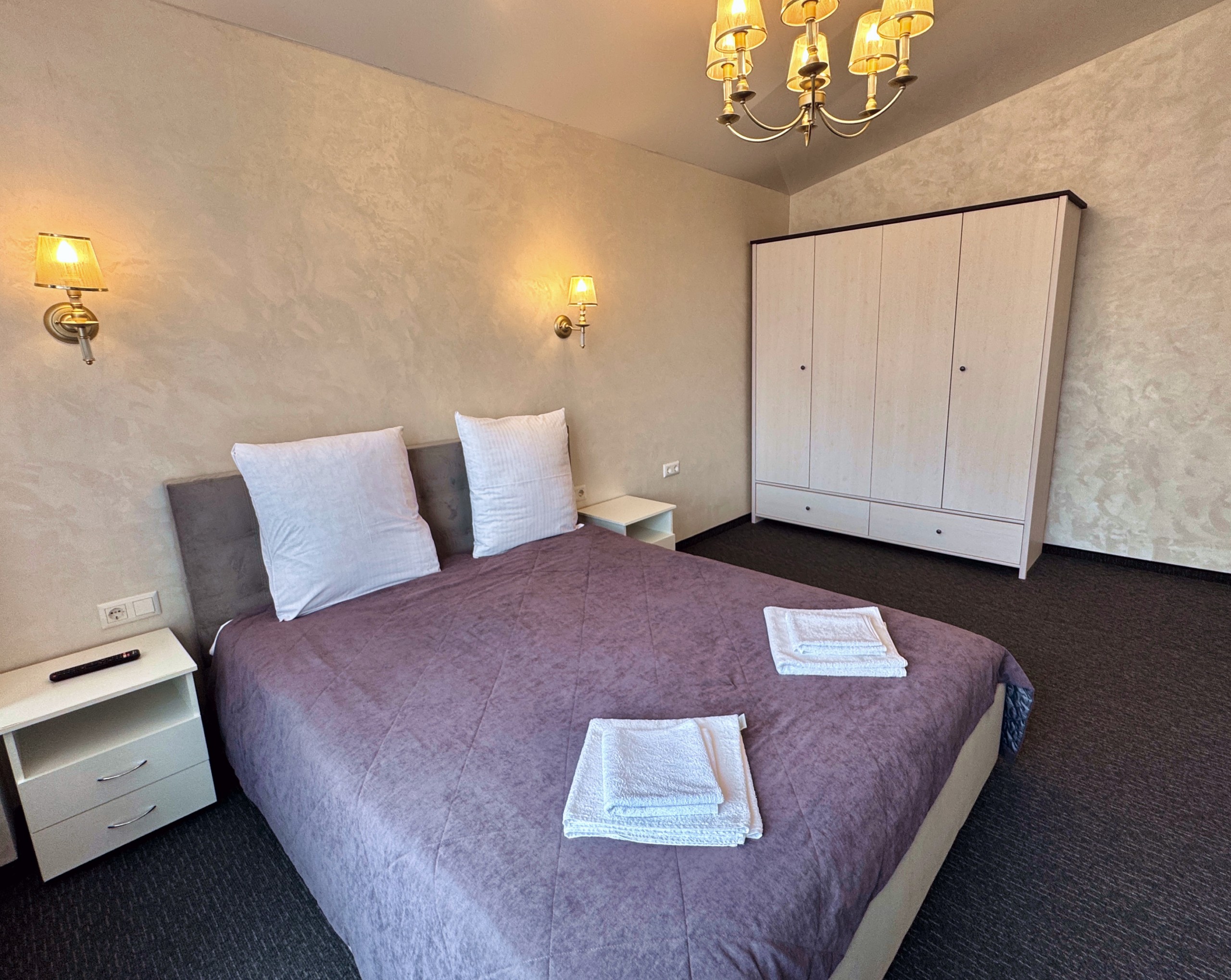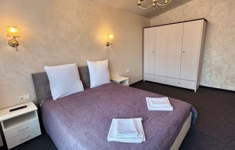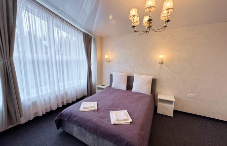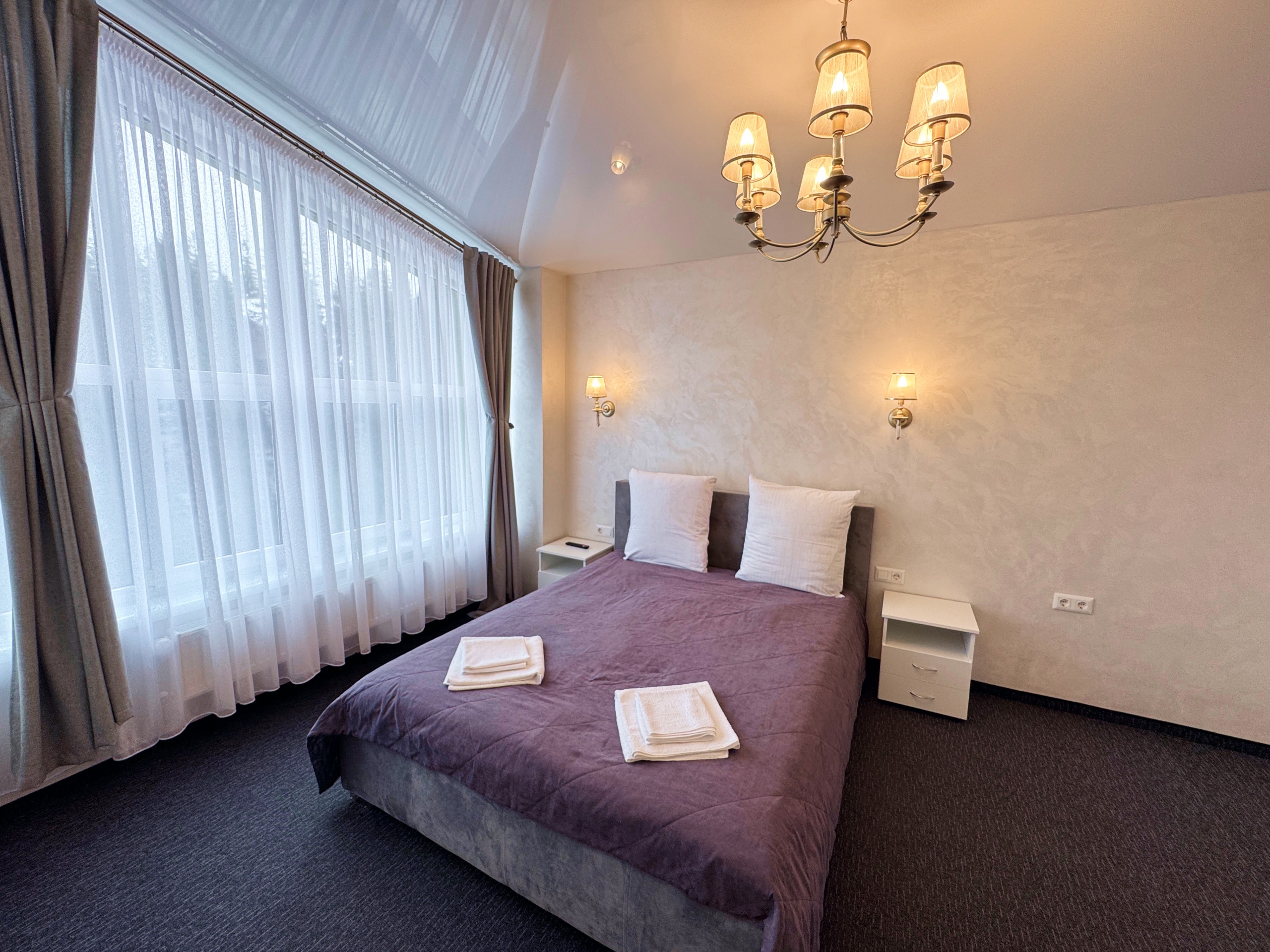 Двокімнатний номер з панорамними видами на драгобратську красу. В першій кімнаті двоспальний розкладний диван, в другій — двоспальне ліжко. кожній кімнаті двоспальне ліжко. Одна кімната прохідна, але є міжкімнатні двері.