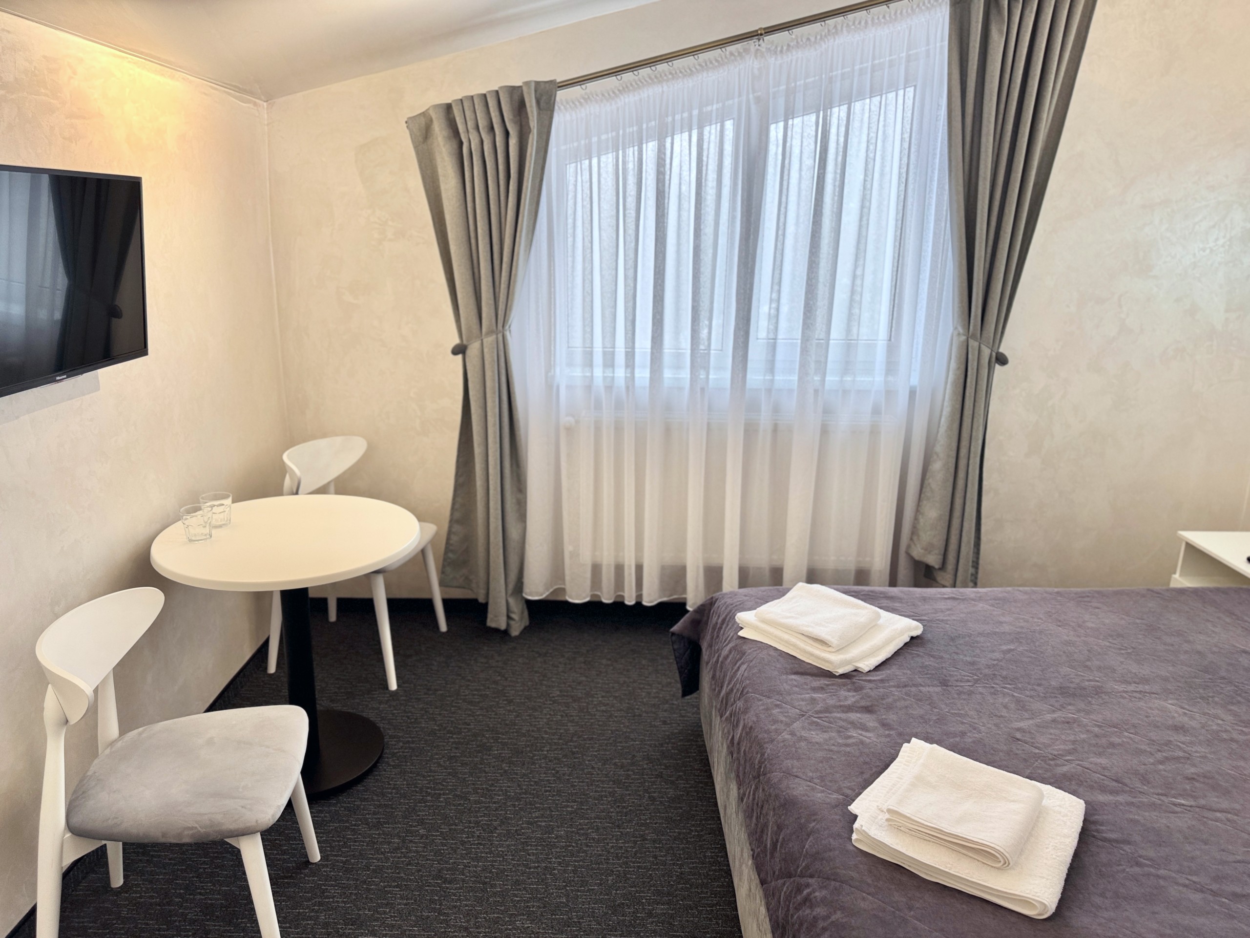 Номер з двоспальним ліжком та панорамним видом на ліс та гори. Санвузел з душовою кабіною та банними рушниками. Достатньо місця для того, щоб розмістити необхідні речі в шафі та тумбочках.